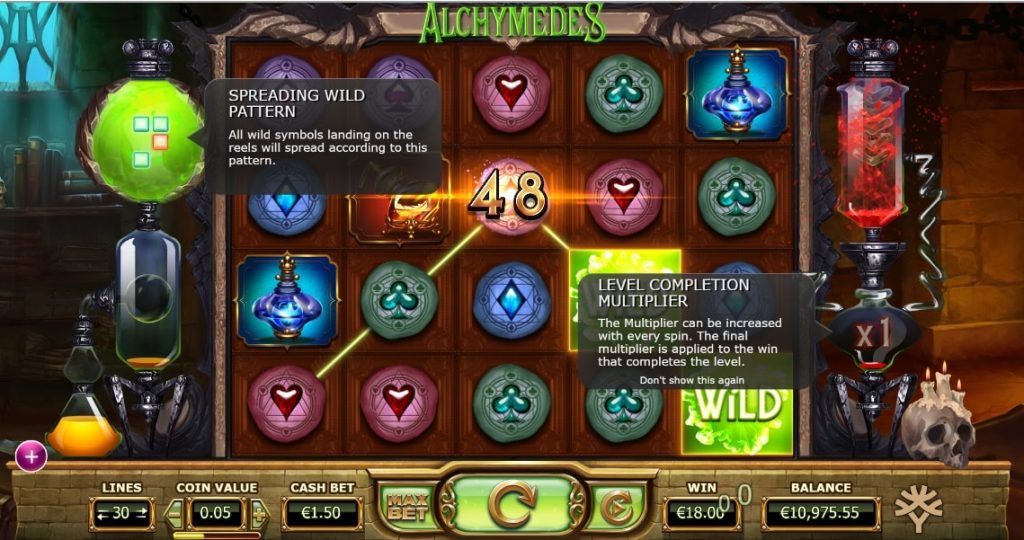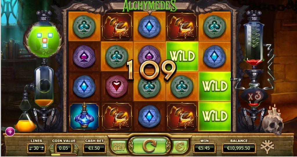 Игровой автомат «Алхимик» наделен пятью барабанами, переплетенными 30 линиями выплат и тремя рядами символов. Учитывая, что выигрыши засчитываются в обе стороны, то фактически число линий выплат составляет 60. Насладиться процессом можно, делая ставки от 0.30 до 60 монет за спин. У слота Alchymedes есть мобильная версия, поэтому он доступен не только на стационарных устройствах.