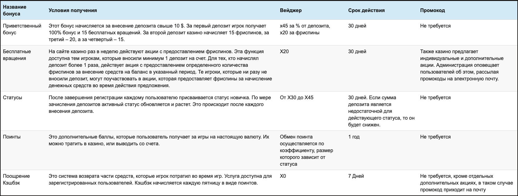 Казино имеет приятную бонусную политику и известно своими щедрыми выплатами. Поэтому стоит разобраться с ними подробнее. Ниже указаны все особенности бонусной политики заведения.