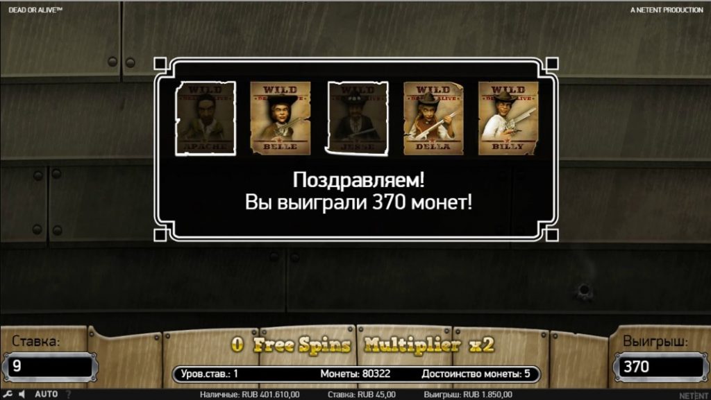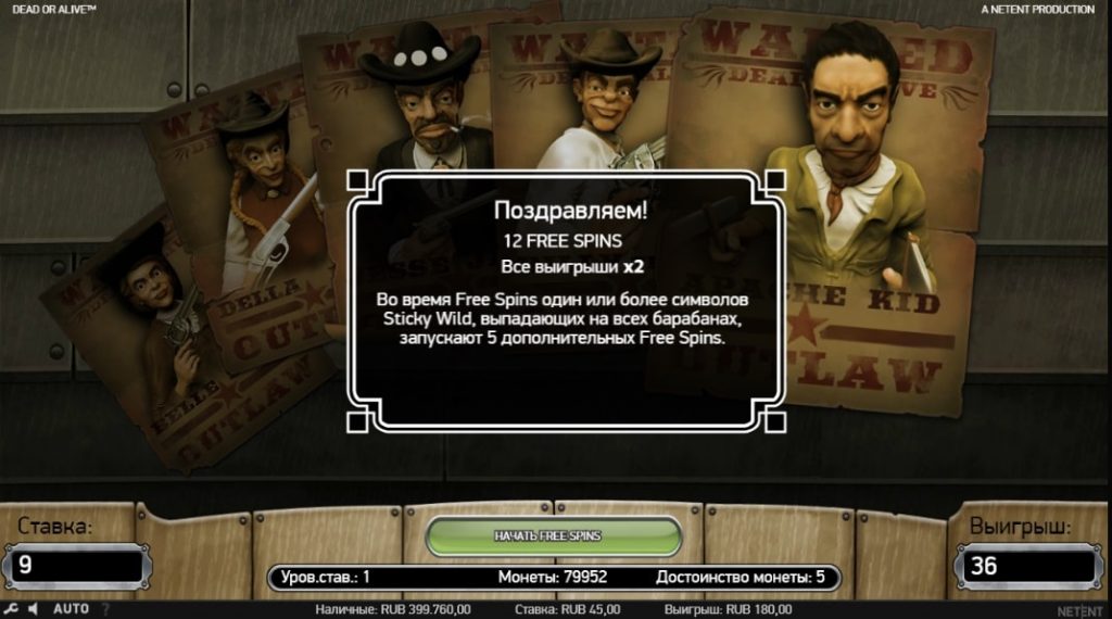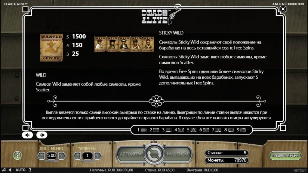 Игровой автомат Dead Or Alive – это разработка провайдера НетЕнт, которая посвящена тематике Дикого Запада. Здесь пользователь побывает в роли ковбоя, который охотится за бандитами. Убейте головорезов, доставьте их к шерифу и получайте до 2500 долларов.