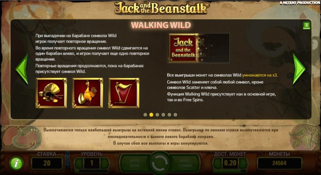 Вы можете играть в Jack and the Beanstalk бесплатно либо на деньги. Риск весьма невысок, а RTP составляет 96,3%. Джекпот в этом слоте не разыгрывается, а максимальный выигрыш составляет х1000.