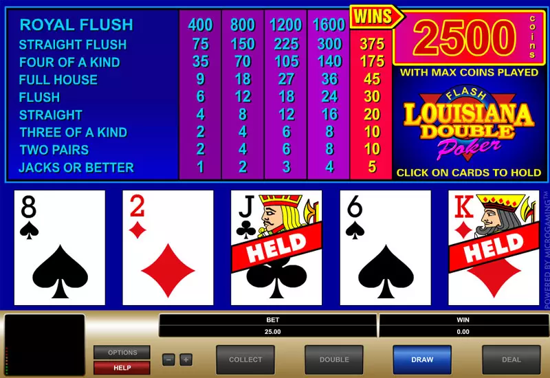 Louisiana Double Flash Poker превосходит другие игры в покер по качеству и количеству бонусов. Например, игра предлагает уникальную "двойную" функцию, которая способна в два раза увеличить ваши выигрыши, и это всего лишь начало.