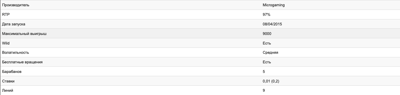 Величина ставки никак не влияет на сам процесс игры, однако выбирать её оптимальный размер нужно с таким расчётом, чтобы размер кредита обеспечивал от 150 до 200 спинов, тогда есть шанс остаться в плюсе. Видеослот имеет высокий процент отдачи, его RTP составляет 97%.
